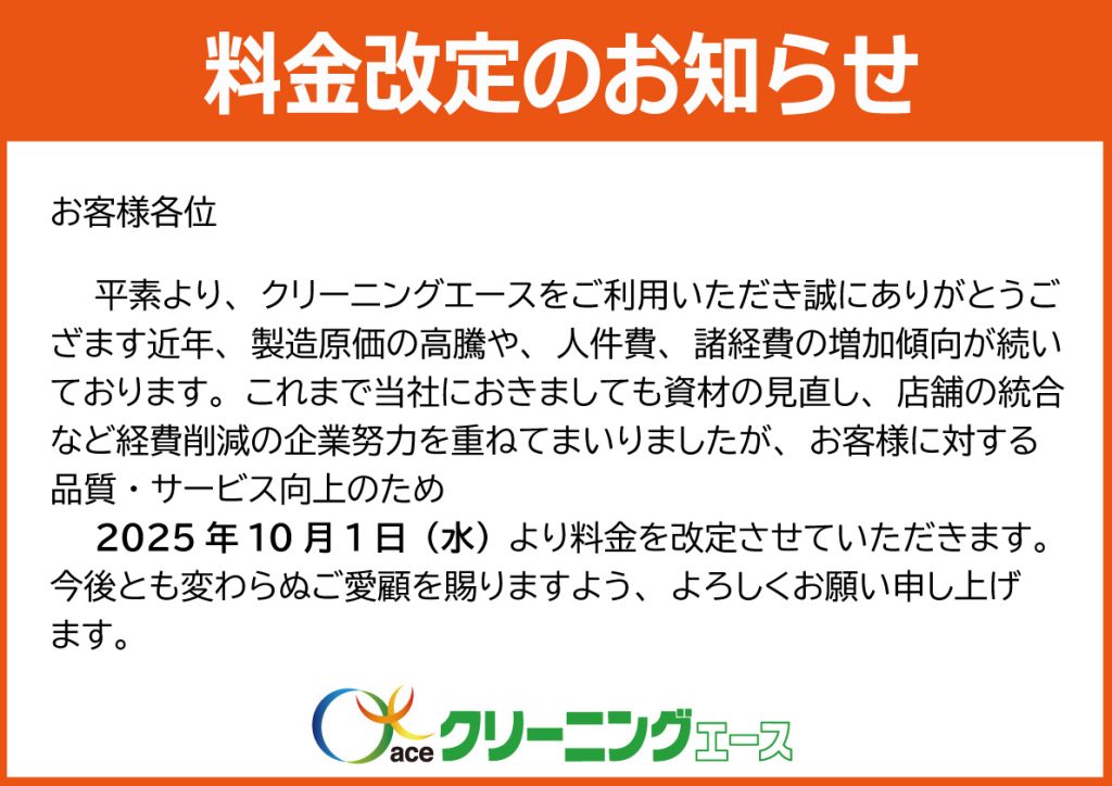 平素より、クリーニングエースをご利用いただき誠にありがとうござます近年、製造原価の高騰や、人件費、諸経費の増加傾向が続いております。これまで当社におきましても資材の見直し、店舗の統合など経費削減の企業努力を重ねてまいりましたが、お客様に対する品質・サービス向上のため2025年10月1日(水)より料金を改定させていただきます。今後とも変わらぬご愛顧を賜りますよう、よろしくお願い申し上げます。
