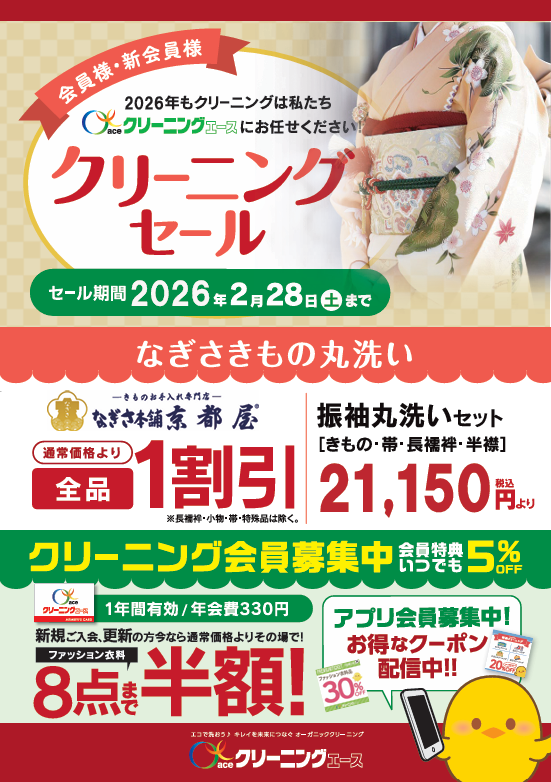 【なぎさきもの丸洗い】 ●きもの丸洗い 1割引き ※小物・長襦袢・帯は除く ●振袖セット 21,150円 (振袖、振袖用長襦袢、帯、半衿)