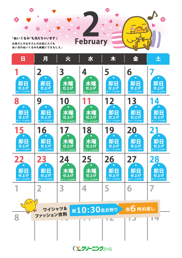 〔ワイシャツ・ファッション衣料品〕※水曜日・工場定休日をのぞく 朝10時30分までお預かり→夕方6時必ずお渡し いつもクリーニングエースをご利用いただきありがとうございます。 つきましては、月曜日締め切り時間朝10時30分以降に受け付けた商品の仕上がりが、木曜日の夕方6時仕上がりとなります。 ご不便をおかけいたしますが、何卒よろしくお願いいたします。 【仕上がり日カレンダー】