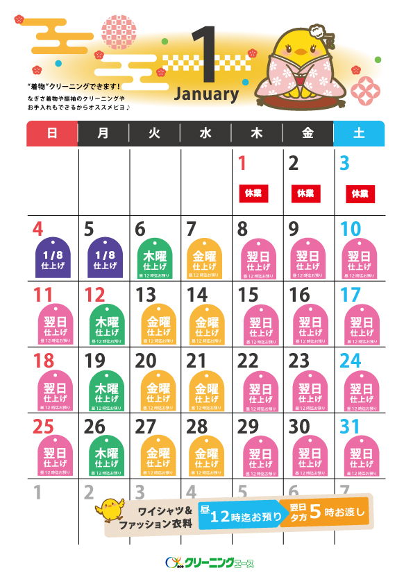 昼12時までお預かり→翌日夕方5時必ずお渡し 〔ワイシャツ・ファッション衣料品〕 ※水曜日・工場定休日をのぞく いつもクリーニングエースをご利用いただきありがとうございます。 つきましては、月曜日締め切り昼12時までに受け付けた商品の仕上がりが、木曜日の夕方5時仕上がりとなります。 月曜日昼12時以降に受け付けた商品の仕上がりは、金曜日の夕方5時仕上がりとなります。 ご不便をおかけいたしますが、何卒よろしくお願いいたします。 【12月仕上がり日カレンダー】