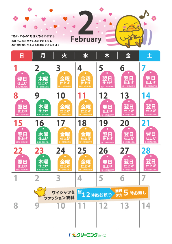 昼12時までお預かり→翌日夕方5時必ずお渡し 〔ワイシャツ・ファッション衣料品〕 ※水曜日・工場定休日をのぞく いつもクリーニングエースをご利用いただきありがとうございます。 つきましては、月曜日締め切り昼12時までに受け付けた商品の仕上がりが、木曜日の夕方5時仕上がりとなります。 月曜日昼12時以降に受け付けた商品の仕上がりは、金曜日の夕方5時仕上がりとなります。 ご不便をおかけいたしますが、何卒よろしくお願いいたします。 【仕上がり日カレンダー】