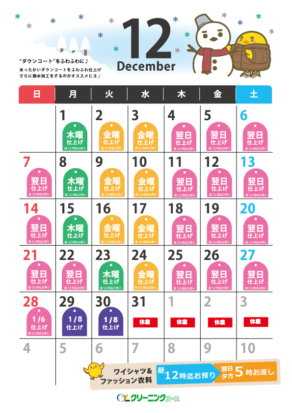 昼12時までお預かり→翌日夕方5時必ずお渡し 〔ワイシャツ・ファッション衣料品〕 ※水曜日・工場定休日をのぞく いつもクリーニングエースをご利用いただきありがとうございます。 つきましては、月曜日締め切り昼12時までに受け付けた商品の仕上がりが、木曜日の夕方5時仕上がりとなります。 月曜日昼12時以降に受け付けた商品の仕上がりは、金曜日の夕方5時仕上がりとなります。 ご不便をおかけいたしますが、何卒よろしくお願いいたします。 【12月仕上がり日カレンダー】