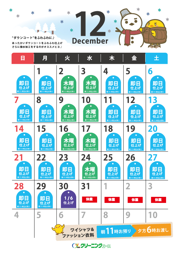 〔ワイシャツ・ファッション衣料品〕 朝11時までお預かり→夕方6時必ずお渡し ※水曜日・工場定休日をのぞく いつもクリーニングエースをご利用いただきありがとうございます。 つきましては、月曜日締め切り時間11時以降に受け付けた商品の仕上がりが、木曜日の夕方6時仕上がりとなります。 ご不便をおかけいたしますが、何卒よろしくお願いいたします。 【12月仕上がり日カレンダー】