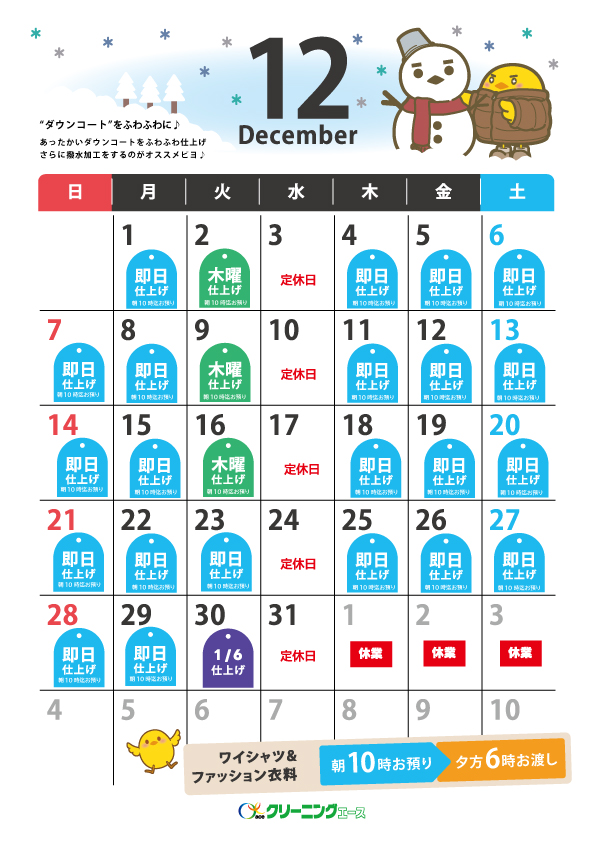 〔ワイシャツ・ファッション衣料品〕 朝10時までお預かり→夕方6時必ずお渡し ※水曜日・工場定休日をのぞく いつもクリーニングエースをご利用いただきありがとうございます。 つきましては、月曜日締め切り時間10時以降に受け付けた商品の仕上がりが、木曜日の夕方6時仕上がりとなります。 ご不便をおかけいたしますが、何卒よろしくお願いいたします。 【12月仕上がり日カレンダー】