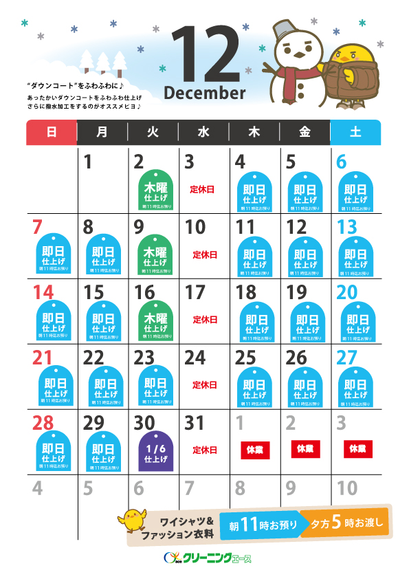 〔ワイシャツ・ファッション衣料品〕 朝11時までお預かり→夕方5時お渡し いつもクリーニングエースをご利用いただきありがとうございます。 つきましては、月曜日締め切り時間11時以降に受け付けた商品の仕上がりが、木曜日の夕方5時仕上がりとなります。 ご不便をおかけいたしますが、何卒よろしくお願いいたします。 【12月仕上がり日カレンダー】