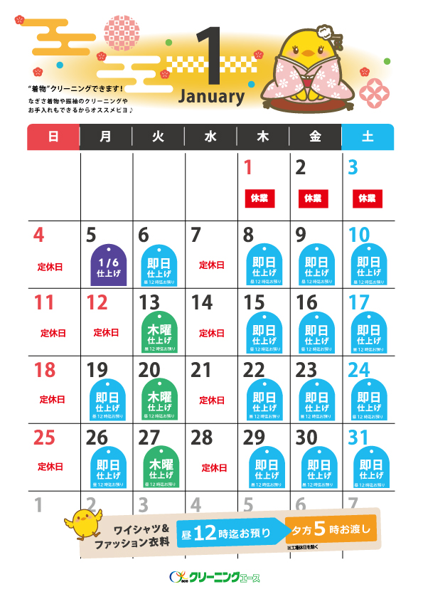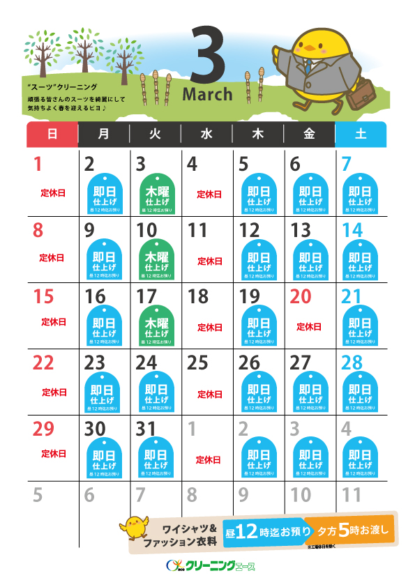 〔ワイシャツ・ファッション衣料品〕 昼12時までお預かり → 夕方5時必ずお渡し ※水曜・日曜・祝日・工場定休日を除く 〔ワイシャツ・ファッション衣料品〕 朝11時までお預かり→夕方5時お渡し いつもクリーニングエースをご利用いただきありがとうございます。 つきましては、月曜日締め切り時間12時以降に受け付けた商品の仕上がりが、木曜日の夕方5時仕上がりとなります。 ご不便をおかけいたしますが、何卒よろしくお願いいたします。 【仕上がり日カレンダー】