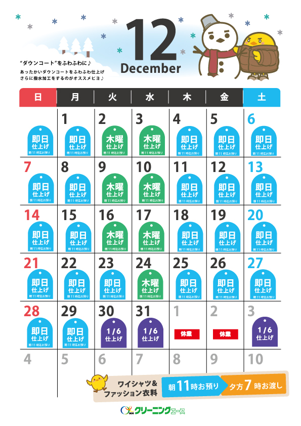 朝11時までお預かり→夕方7時必ずお渡し 〔ワイシャツ・ファッション衣料品〕※水曜日・工場定休日をのぞく いつもクリーニングエースをご利用いただきありがとうございます。 つきましては、月曜日締め切り時間11時以降に受け付けた商品の仕上がりが、木曜日の夕方7時仕上がりとなります。 ご不便をおかけいたしますが、何卒よろしくお願いいたします。 【12月仕上がり日カレンダー】