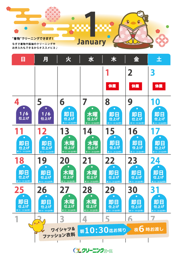 〔ワイシャツ・ファッション衣料品〕 朝10時30分までお預かり→夕方6時必ずお渡し ※水曜日・工場定休日をのぞく いつもクリーニングエースをご利用いただきありがとうございます。 つきましては、月曜日締め切り時間朝10時30分以降に受け付けた商品の仕上がりが、木曜日の夕方6時仕上がりとなります。 ご不便をおかけいたしますが、何卒よろしくお願いいたします。 【仕上がり日カレンダー】