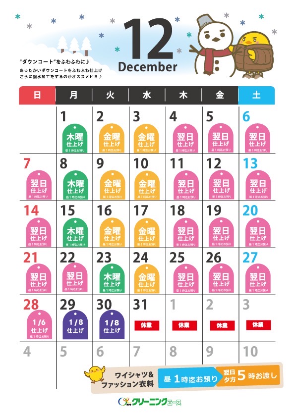 昼1時までお預かり→翌日夕方5時必ずお渡し 〔ワイシャツ・ファッション衣料品〕※水曜日・工場定休日をのぞく いつもクリーニングエースをご利用いただきありがとうございます。 つきましては、日曜日13時以降に受け付けた商品の仕上がりが、木曜日の夕方5時仕上がりとなります。 月曜日13時以降に受け付けた商品の仕上がりは、金曜日の夕方5時仕上がりとなります。 ご不便をおかけいたしますが、何卒よろしくお願いいたします。 【12月仕上がり日カレンダー】