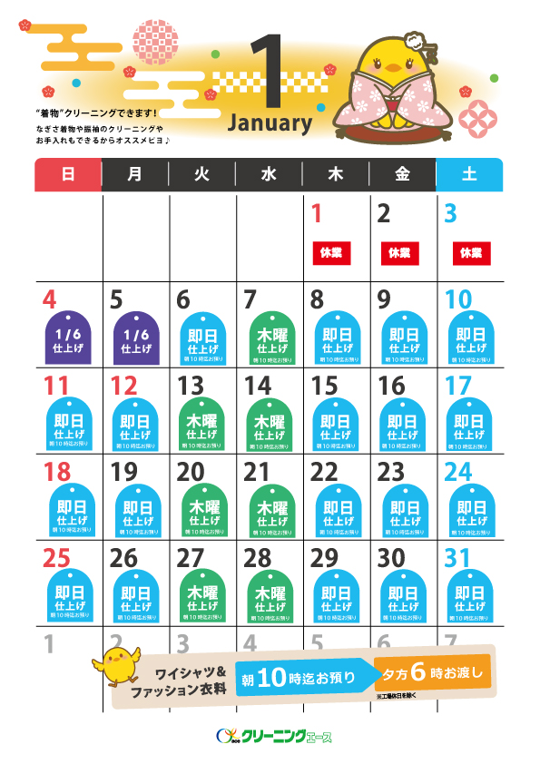 〔ワイシャツ・ファッション衣料品〕 朝10時までお預かり→夕方6時必ずお渡し ※水曜日・工場定休日をのぞく いつもクリーニングエースをご利用いただきありがとうございます。 つきましては、月曜日締め切り時間11時以降に受け付けた商品の仕上がりが、木曜日の夕方6時仕上がりとなります。 ご不便をおかけいたしますが、何卒よろしくお願いいたします。 【1月仕上がり日カレンダー】