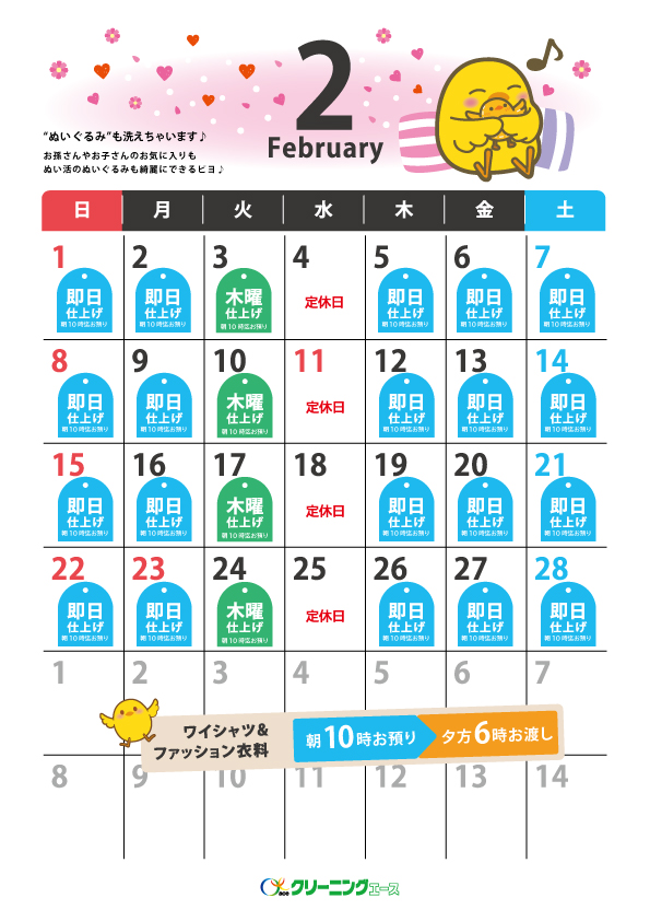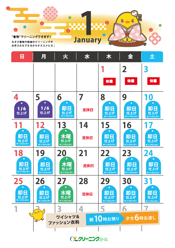 〔ワイシャツ・ファッション衣料品〕 朝10時までお預かり→夕方6時必ずお渡し ※水曜日・工場定休日をのぞく いつもクリーニングエースをご利用いただきありがとうございます。 つきましては、月曜日締め切り時間10時以降に受け付けた商品の仕上がりが、木曜日の夕方6時仕上がりとなります。 ご不便をおかけいたしますが、何卒よろしくお願いいたします。 【仕上がり日カレンダー】