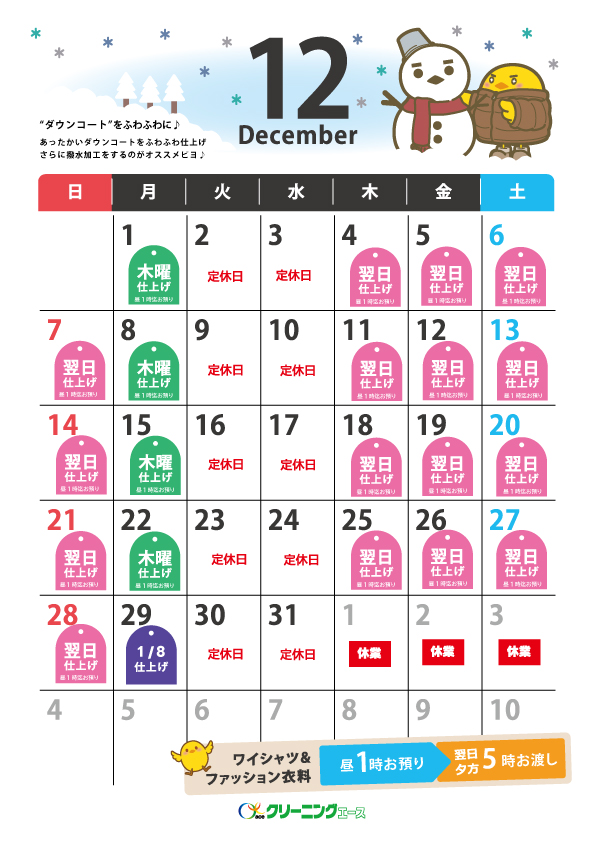 〔ワイシャツ・ファッション衣料品〕 昼1時までお預かり→翌日夕方5時必ずお渡し ※水曜日・工場定休日をのぞく 【12月仕上がり日カレンダー】